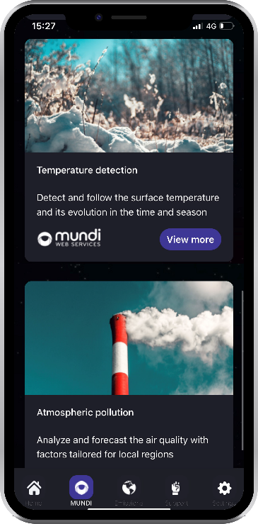 Terra² offers users a number of tracking options, such as Air Pollutants, Pollutant Evolution from COP21 to COP26 and Carbon Monitoring, and the ability to track them across a region or city of their choice. The app also includes a direct link to information on and online demos of 5 of the Mundi services – these are Greenhouse Gas Monitoring, Temperature Detection, Fresh Surface Water Monitoring, Atmospheric Pollution and Vegetation Detection.