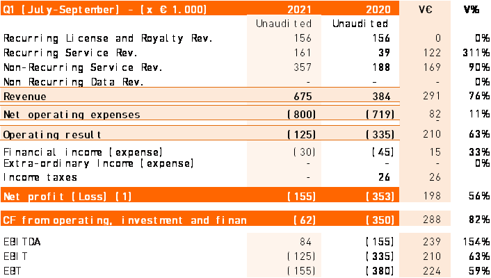 Looking back at this first quarter, GeoJunxion’s business continued to show resilience and good performance, in spite of the fact that this quarter is traditionally slow due to the summer holiday season, during which most of the companies reduce their activities. Revenue grew by 76% compared to the same quarter in 2020 and order intake showed growth of about 53% compared to the same period last year.