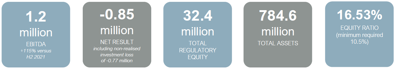 Operating result (EBITDA) amounted to CHF 1.27 million (vs CHF -0.144 million in H1 2021). EBIDTA more than doubled relative to H2 2021 (+115%).