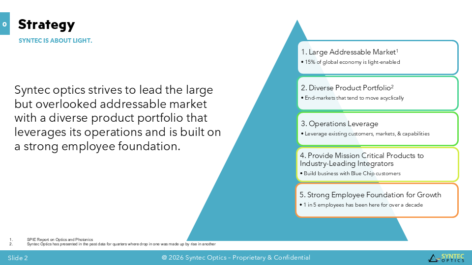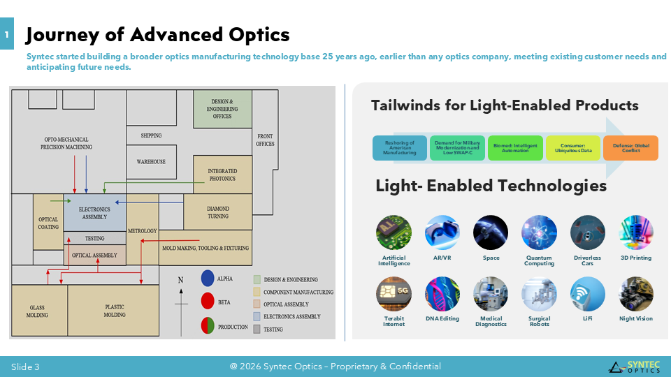 Syntec Optics Holdings, Inc. (Nasdaq: OPTX), headquartered in Rochester, NY, is one of the largest custom and diverse end-market optics and photonics manufacturers in the United States. Operating for over two decades, Syntec Optics runs a state-of-the-art facility with extensive core capabilities of various optics manufacturing processes, both horizontally and vertically integrated, to provide a competitive advantage for mission-critical OEMs. As more products become light-enabled, Syntec Optics continues to add new product lines, including recent Low Earth Orbit (LEO) satellite optics for communications, lightweight night-vision goggle optics for defense, biomedical optics for diagnostics and surgery, and data center optics for Artificial Intelligence. According to SPIE, across the entire field of optics and photonics, the monetary value of all light-enabled products and related services amounts to over 15% of worldwide economic output (nearly $16 trillion of the total $106 trillion value of all finished goods and services produced worldwide in 2023).To learn more, visit www.syntecoptics.com.